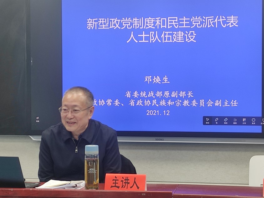 邓焕生主任聚焦于新型政党制度,从五个方面阐述加强新时代民主党派代表人士队伍建设的时代背景、重要意义、主要方面和具体举措:从民主党派历史和现状出发明确各民主党派是我国新型政党制度中的参政党;从利益代表、力量整合和治理效果三个维度深化对新型政党制度“三新”的理解;从我国优秀文化传统和多党合作历史出发深化对新型政党制度的中国特色的理解;从加强民主党派领导班子、组织队伍、履职能力建设等方面坚持好发展好完善好新型政党制度;采取切实有效措施搞好民主党派代表人士队伍建设。