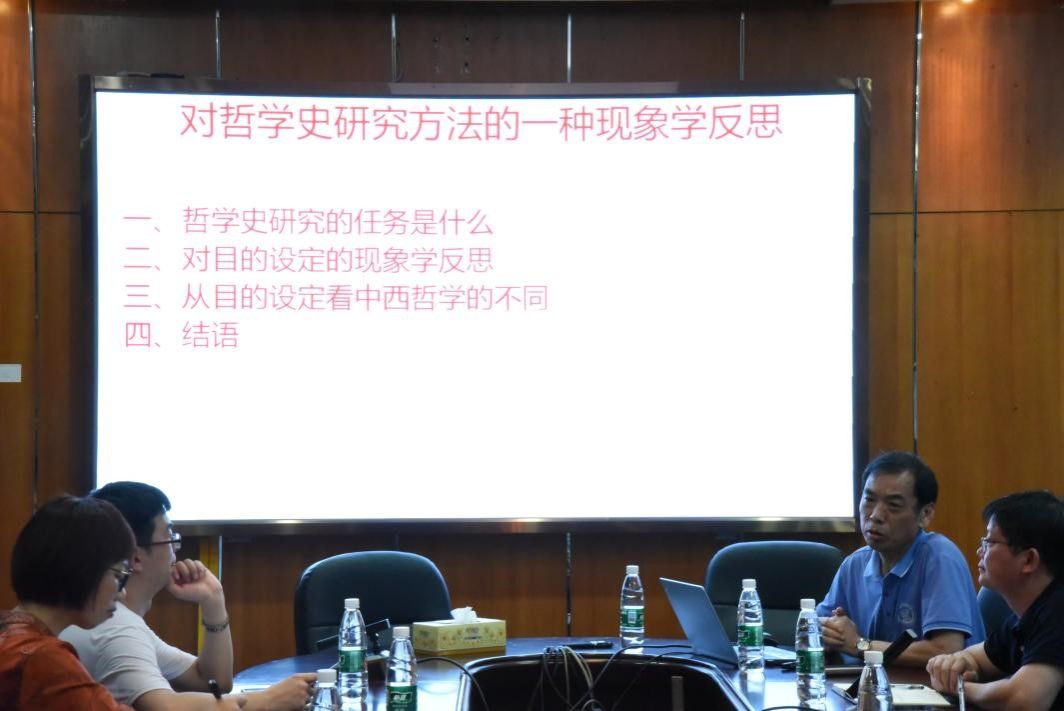 张廷国教授从三个方面展开此次讲座的主要内容。首先,张教授基于西方哲学史上三位著名哲学家——亚里士多德、黑格尔和胡塞尔的观点,探讨了他对哲学史研究任务的理解。张教授认为,哲学史研究的任务不在于从外部事实方面入手探究已有的哲学观点、命题或理论,而在于从内部、从历史精神构成物方面入手寻找哲学史中的目的设定。接着,张教授详尽地展示了对哲学史中目的设定进行现象学反思的路径。他认为至少有如下三个方面的研究值得开展:其一,对古代哲学思想进行反思;其二,对后来解释性的哲学思想进行反思;其三,对当下的哲学思想进行反思。张教授强调,对哲学史中目的设定开展现象学反思具有积极的和消极的两重意义。就积极层面而言,反思的意义在于重塑哲学,或者说回应我们现在到底需要什么样的哲学。就消极层面而言,反思的意义则在于防止对哲学史的误解,克服过度诠释的哲学。随后,张教授透过哲学史中的目的设定审视中西哲学的差异。张教授认为,西方哲学主流上是遵循理性目的论的设定,走出了一条后物理学的哲学之路,而中国传统哲学大体上是坚持人性目的论的设定,发展出一条后伦理学的哲学道路。