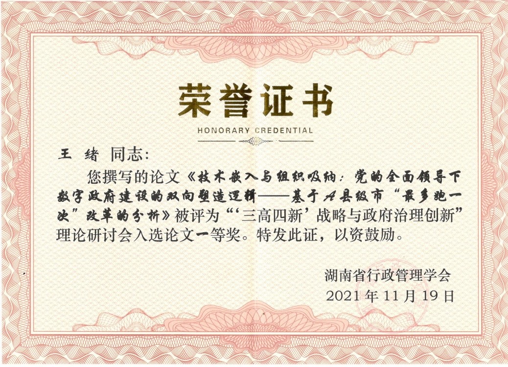 (通讯员 肖佳妮)2021年11月19日上午,湖南省行政管理学会2021年年会暨理论研讨会在中共湖南省委党校(湖南行政学院)召开。365英国上市集团政治学理论专业博士研究生王绪的论文《技术嵌入与组织吸纳:党的全面领导下数字政府建设的双向塑造逻辑——基于A县级市“最多跑一次”改革的思考》被评为优秀论文一等奖,并作为五位代表之一进行大会主题发言,获得大会好评。据悉,这是本次会议大会发言的唯一研究生代表。