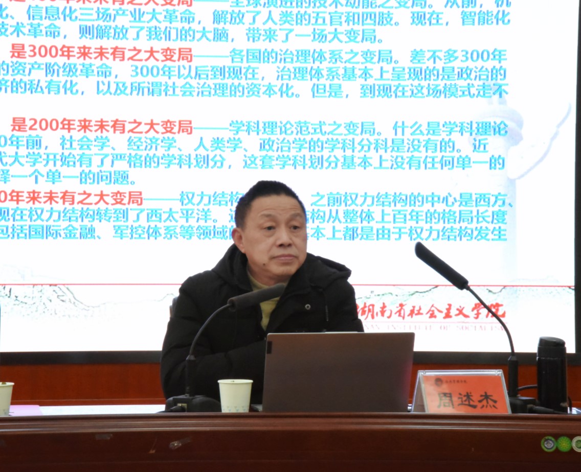 (通讯员 辜叙林)2023年2月24日下午,“正大日新”研究生大讲堂第十讲在景德楼四楼学术报告厅顺利举行。湖南省社会主义学院周述杰院长应邀开展了题为“深刻理解和大力推进中国式现代化”的学术讲座。讲座由我院政治学硕士点统一战线学方向李超民教授主持。我院130余研究生参加讲座。