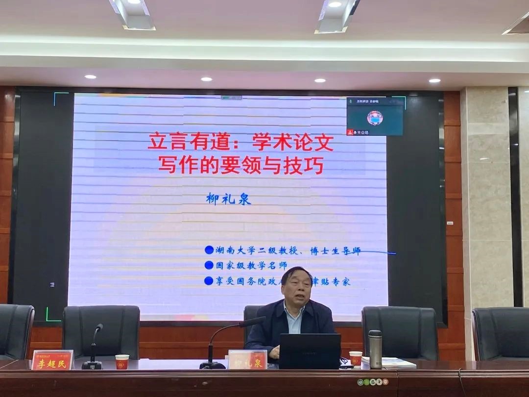 (通讯员 王媛)2022年5月11日,我院“正大日新”研究生大讲堂第五讲在博后楼四楼报告厅顺利举行。湖南大学二级教授、博士生导师柳礼泉教授应邀作了题为“学术论文写作的要领与技巧”的专题讲座。此次讲座由我院副院长李超民教授主持,按照疫情防控要求,我院部分青年教师以及2020级、2021级全体研究生以线下和线上两种方式参加讲座,共计500余人。