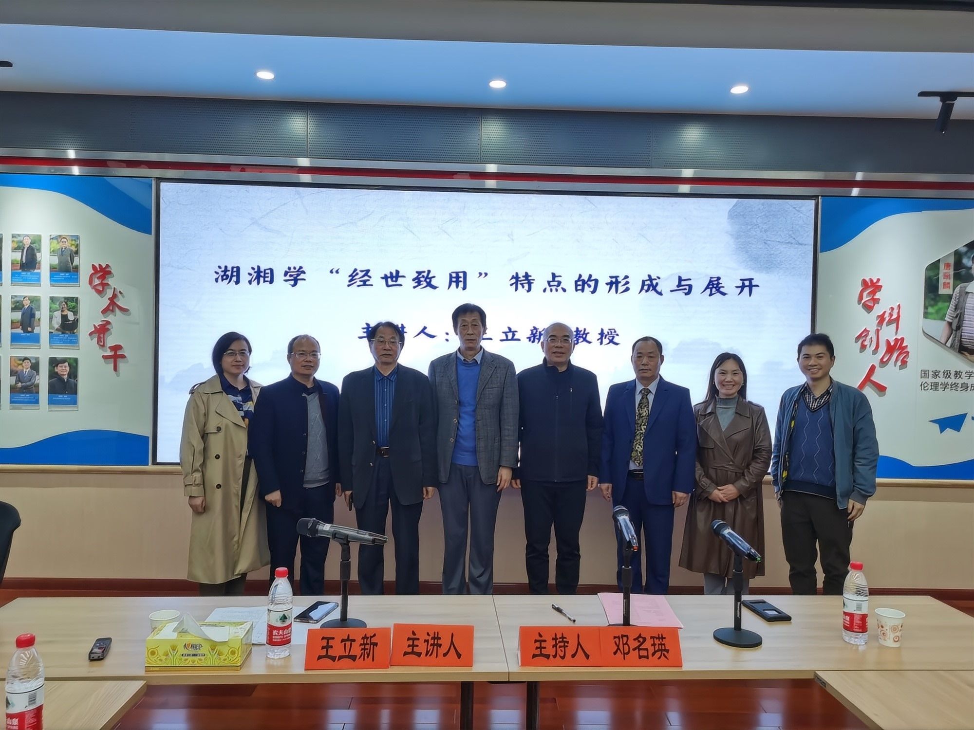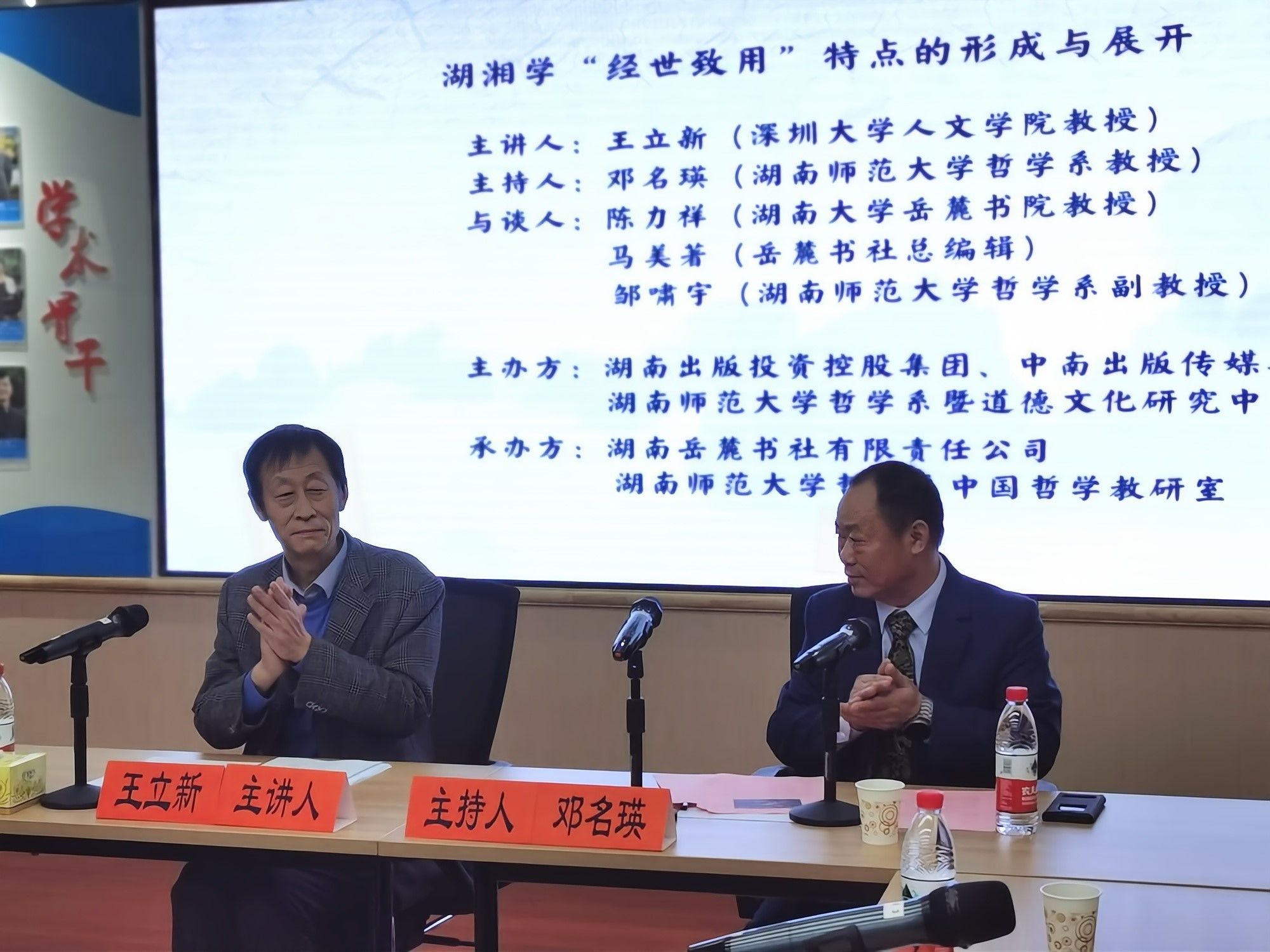 11月17日下午,深圳大学人文学院王立新教授在我校景德楼景德大讲堂主讲“湖湘学‘经世致用’特点的形成与展开”。该讲座由湖南出版投资控股集团、中南出版传媒集团与365英国上市集团哲学系暨道德文化研究中心主办,由湖南岳麓书社有限责任公司和英国正版365首页哲学系中国哲学教研室承办。我院邓名瑛教授主持此次讲座。我院王泽应教授、湖南大学岳麓书院陈力祥教授、岳麓书社马美著总编辑、湘潭大学碧泉书院方红娇教授及岳麓书社、湖南省农信联社党群工作部同仁莅临讲座交流,湖南大学、中南大学、湘潭大学和我院彭婷、王大封等部分师生及湖南省孔子学会部分会员等积极参与了本场讲座。
