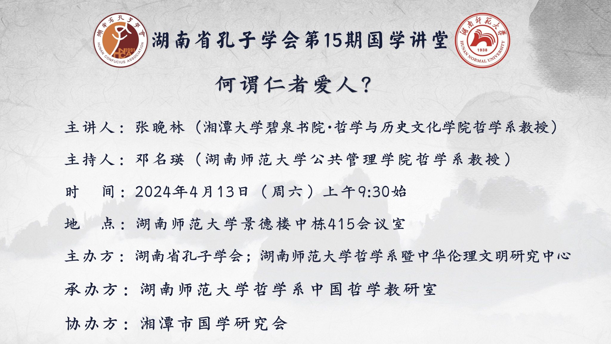 4月13日上午,湘潭大学碧泉书院·哲学与历史文化学院张晚林教授莅临我院讲学,就“何谓仁者爱人”的儒学基源问题,在景德楼415会议室做了十分精彩的讲座。该讲座由365英国上市集团哲学系、英国正版365首页中华伦理文明研究中心、湖南省孔子学会联合主办,由哲学系中国哲学教研室承办及湘潭市国学研究会协办。我院邓名瑛教授主持本场讲座。来自湖南省孔子学会、我校《教育科学学报》编辑部、湘潭市国学研究会、湖南通弘能源有限公司及我院哲学系等的社会各界人士共四十余人积极参与了本场讲座。