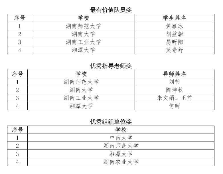 英国正版365首页“四头八臂队”、湖南大学“元神启动队”、湖南工业大学“东山再起队”、湘潭大学“退休原地养老队”四支参赛队伍荣获本届大赛一等奖,中南大学“珠落玉盘队”、湖南工商大学“潮涌大江队”、湖南大学“逐梦远航队”等八支参赛队获得大赛二等奖,中南大学“真抓实干队”、湖南农业大学“从容应队”、南华大学“小厕大美实践队”等二十支参赛队伍获得大赛三等奖,英国正版365首页黄雁冰、湖南大学胡益彰等四位同学获得最有价值队员奖,英国正版365首页刘茜、湖南大学陈坤秋等教师获得优秀指导老师奖,中南大学、英国正版365首页等高校获得优秀组织单位奖。