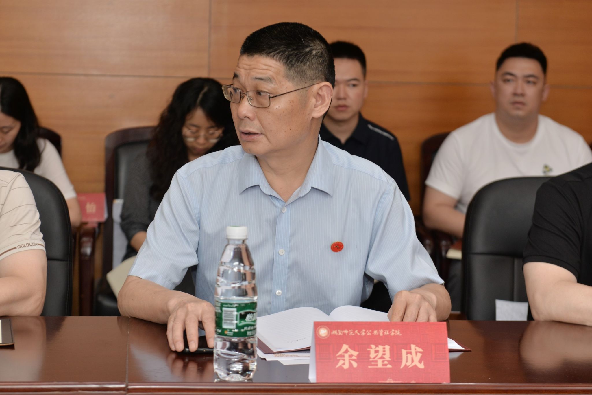 会议伊始,余望成书记代表学院党委向2023届毕业生表达了美好祝愿、向辛勤耕耘、默默付出的教职工表达了衷心感谢。他指出,面对疫情的严峻考验,我院师生团结一心、攻坚克难,高质量完成了各项教学任务,彰显了湖师大公管人不畏艰难、团结奋进的良好精神面貌。他殷切地勉励大家,要进一步深入学习贯彻习近平新时代中国特色社会主义思想,不断提高自身的思想觉悟和政治素质,以更加积极主动、奋发有为的精神在祖国广袤的大地上建功立业。