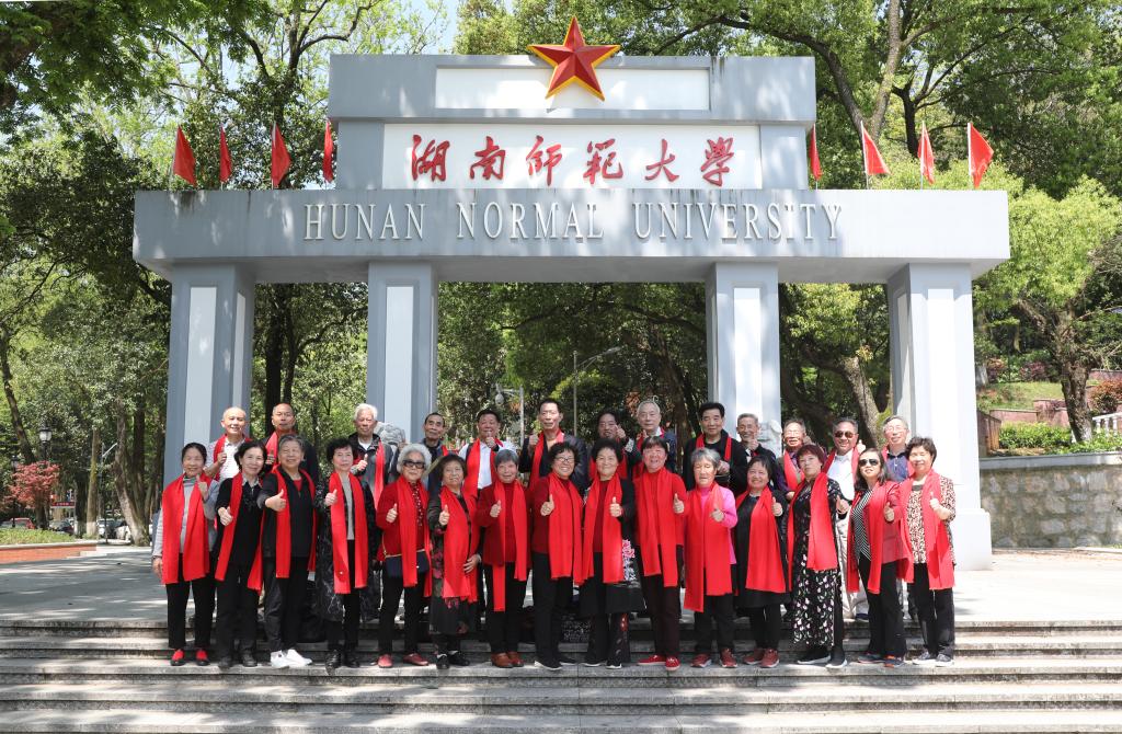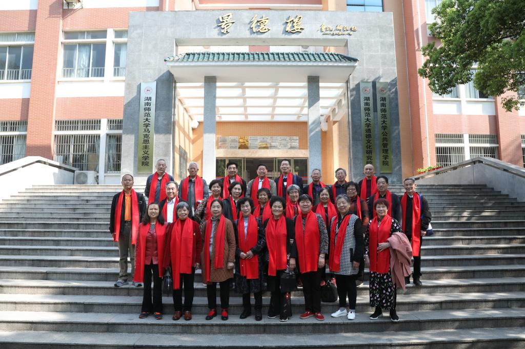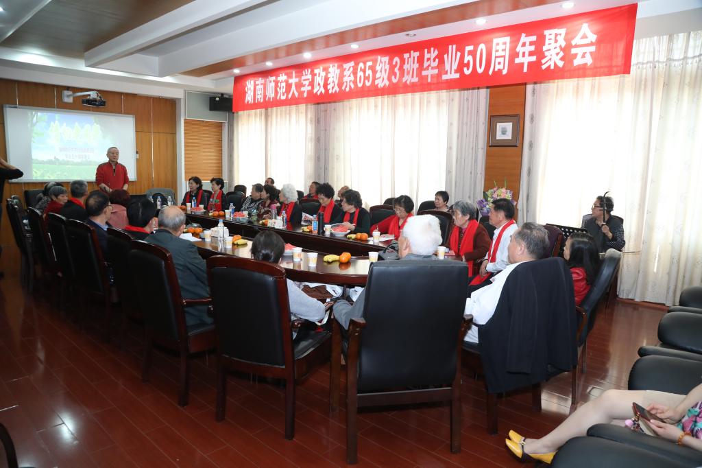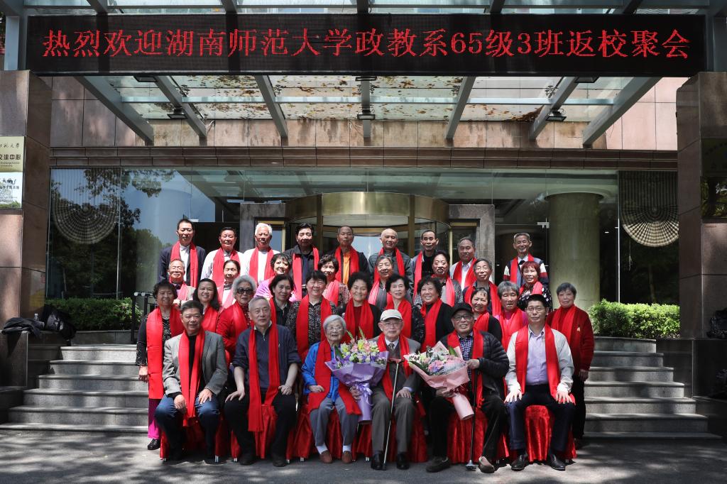 2019年4月7日,我校政教系65级3班26名校友连同部分家属从三湘四水回到母校,365英国上市集团分管校友工作的邝洁副院长与院有关工作人员热情接待了返校校友。中午,校友们欢聚红楼,邀请原系主任苏醒老师和任课教师唐凯麟老师参加了毕业50周年午宴。学院党委书记余望成老师出席并致欢迎辞,他对校友们心系母校、常念母系的真情表示衷心感谢,更祝愿校友们家庭幸福、健康长寿,也希望校友们常回家看看。两位受邀教师与50年未见的学生们相聚在一起非常高兴,对同学们珍贵的友谊十分感动,为同学们取得的成就无比自豪。他们还畅谈人生体会,表达了对学生们的美好祝愿。学生代表陈达道在午宴上致答谢词,他满怀对恩师的敬意、对母校的感激,追忆似水年华,畅抒同窗情谊,深情地说:“岳麓山得天独厚的风水滋润了我们,母校老师谆谆教诲哺育了我们。谢谢您,我们魂牽梦萦的母校!谢谢您,我们可敬可亲的老师!”