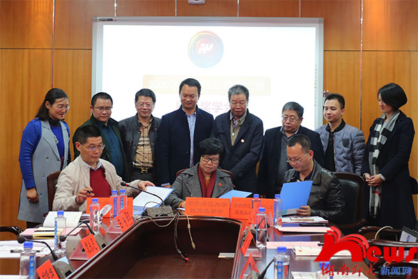 仪式上,周俊武代表学校接受捐赠。校友代表袁永恩、我校校友总会秘书长杨玲和余望成共同签署捐赠协议。
