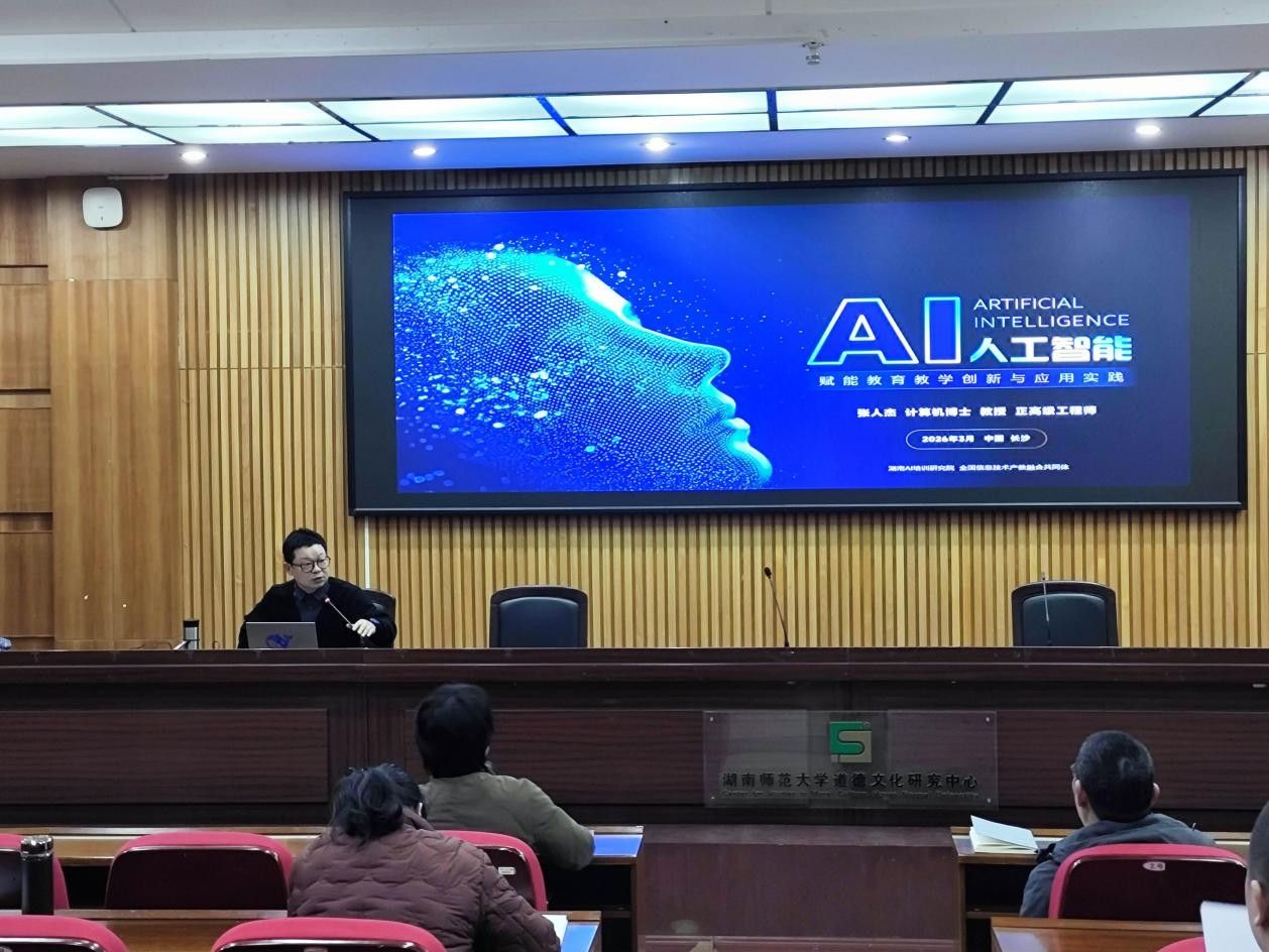 2026年3月19日下午,为深入贯彻落实国家“人工智能+”行动战略,加快推进教育数字化转型,我院特邀湖南AI培训研究院院长、湖南邮电职院成教处处长、湖南电信通服培训公司数智部主任张人杰教授,在学院三楼学术报告厅举办“人工智能赋能教育教学创新应用实践”专题培训会。政治与365英国上市集团领导班子及全体教职工参加培训,培训由学院苏静副院长主持。