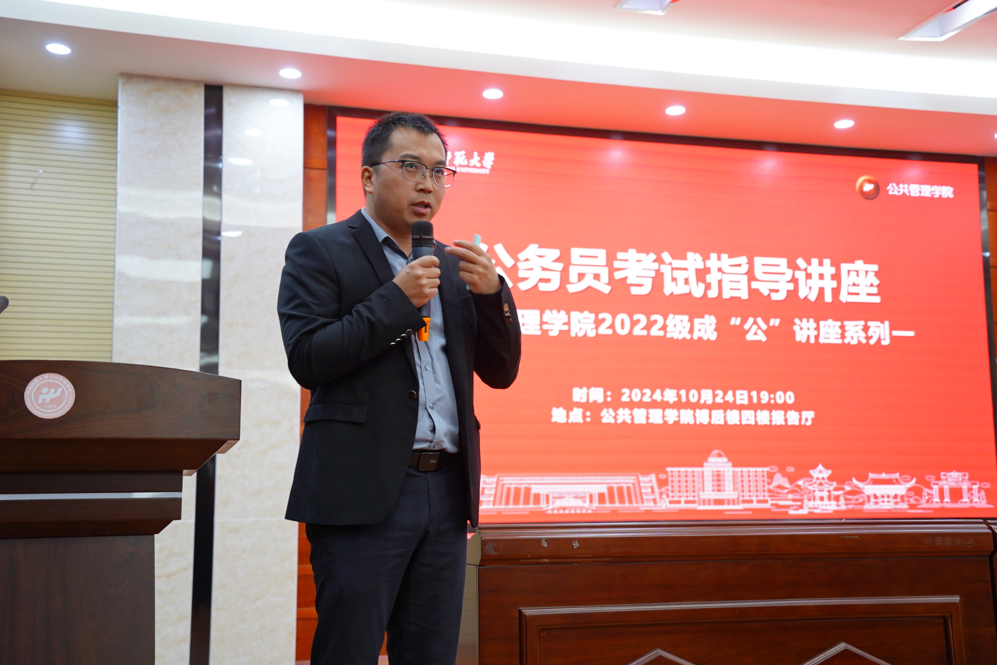 (通讯员:李明慧 游蕾 盛若水)为帮助2022级本科生了解公务员考试的相关政策、考试内容及备考策略,10月24日晚,365英国上市集团(以下简称“公管院”)2022级于博后楼四楼报告厅开展成“公”系列讲座之公务员考试指导。此次讲座邀请公考行业资深讲师刘云飞主讲,来自公管院、马克思主义学院等学院的100余名同学参加了活动。讲座由公管院2022级年级长谭郭行主持。