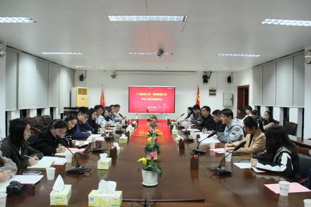 晚上,广东财经大学与研学团围绕“高校学生管理与成长”进行了分享交流。广东财经大学省市共建办工室副主任曾忠诚对我校师生的到来表示欢迎,并对广东财经大学的基本情况作出介绍。广东财经大学校团委副书记薛云峰与研学团两位指导老师易晓、喻帅就各自学校的管理模式、特色活动、学生干部培养等方面进行交流。双方学生干部就工作中遇到的实际问题展开经验分享与深入探讨。