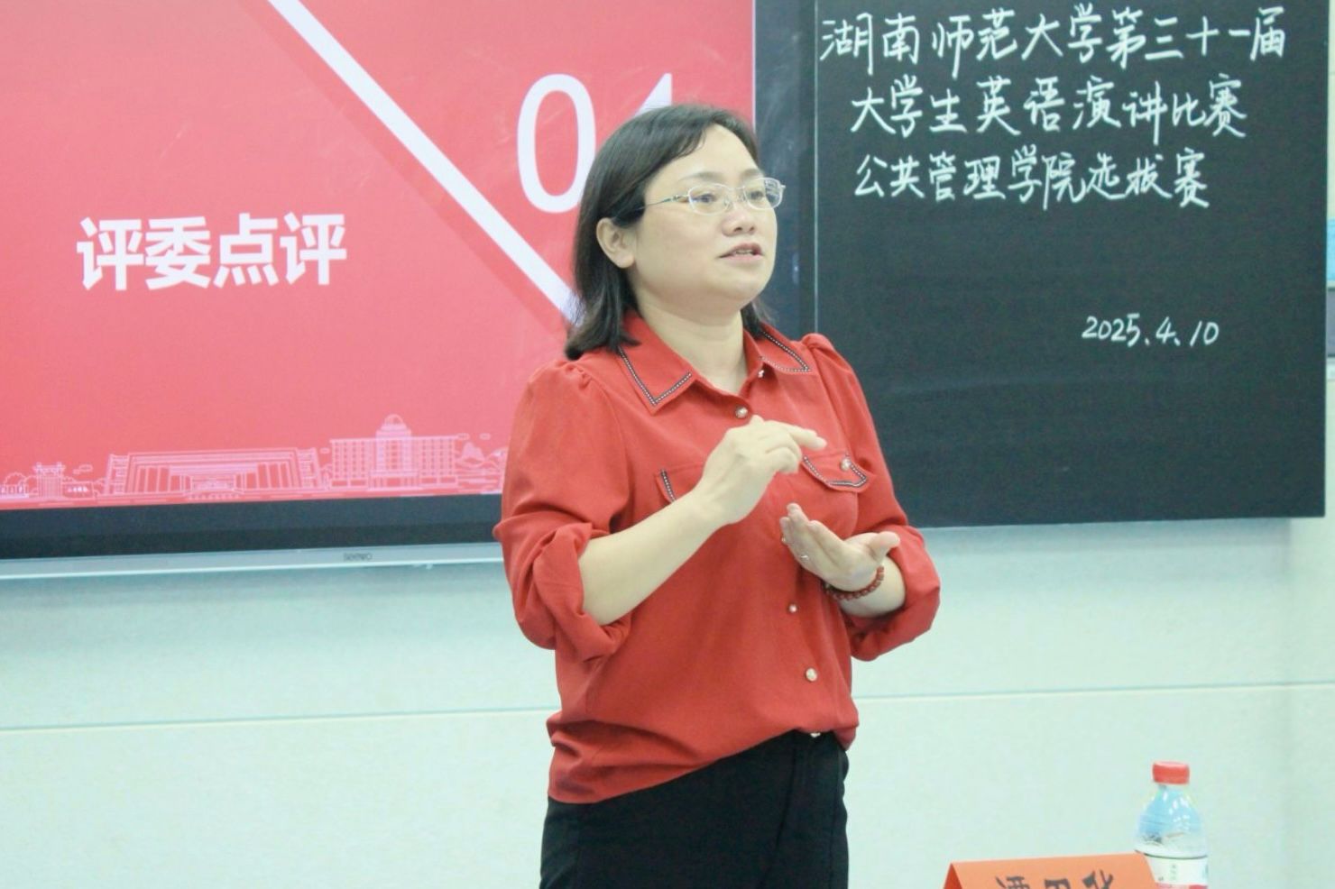 演讲结束后,谭卫华和颜琳分别对选手们的现场表现进行点评。谭卫华肯定了选手们的赛场表现,并结合教学经验,从英语发音、肢体语言、演讲技巧等方面对选手们提出建议。颜琳则肯定选手们敢赛、会赛、善赛的勇气与能力,同时指出演讲过程中互动意识与表情管理的重要性。她认为,选手们的演讲稿撰写应有深度、有逻辑、有层次,准确把握主旨。点评结束后,评委老师们根据选手们的综合表现,评选出一、二、三等奖并为获奖选手颁奖。