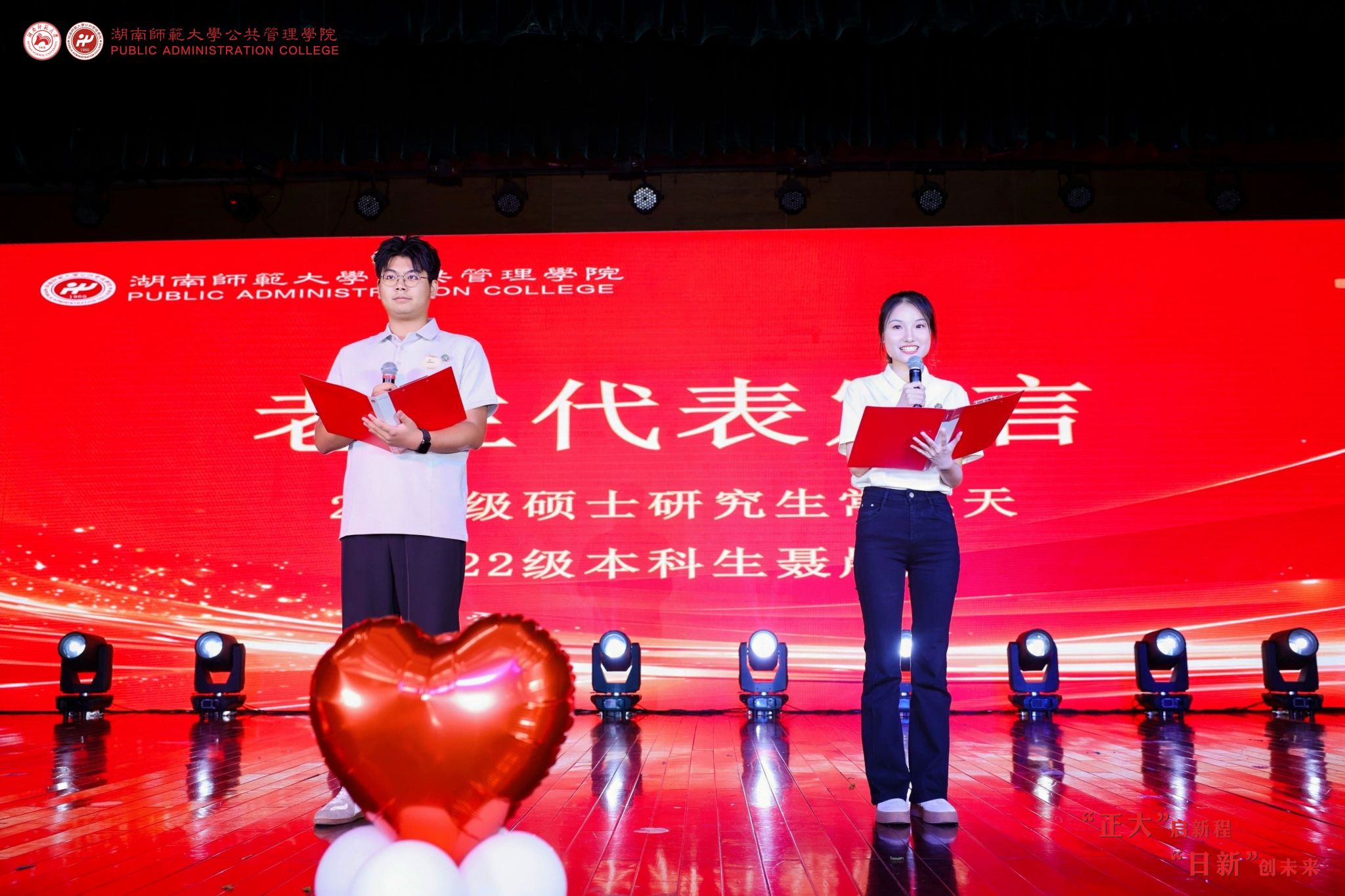 教师代表政行与行政管理系胡扬名教授围绕“立志、学习、责任、生活”四个关键词发言,鼓励新生保持“坐得住”的耐心、秉持“问得出”的勇气、锤炼“用得上”的智慧,将个人成长融入国家发展,让青春梦想助力民族复兴。