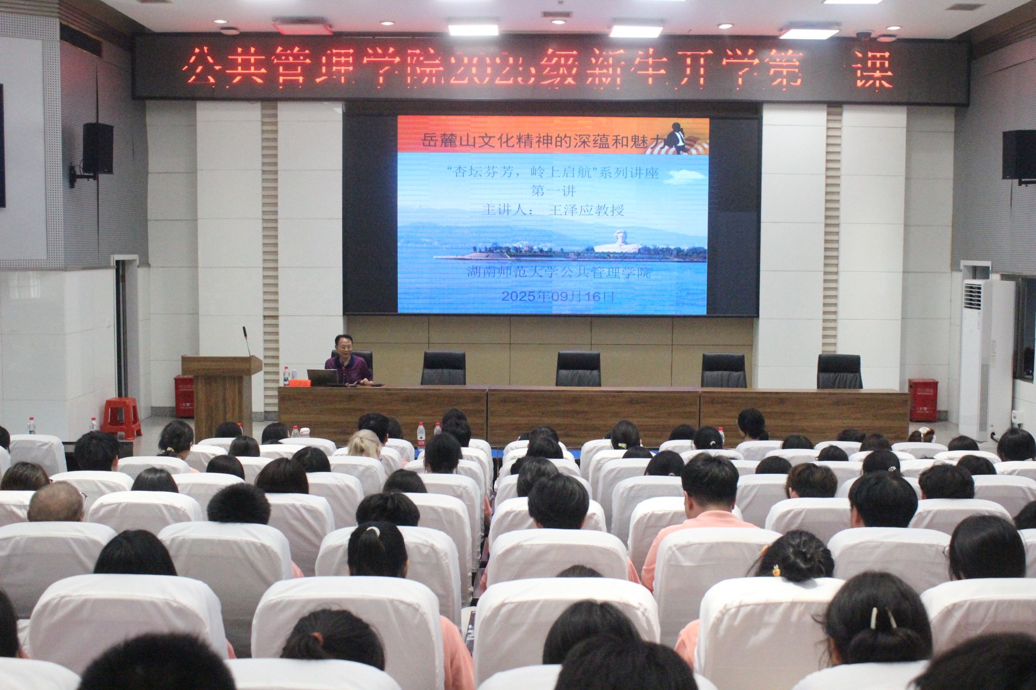 王泽应教授以“历史-精神-时代价值”为主线,生动解读岳麓山背后的湖湘文化密码。他通过“朱张会讲”的历史典故,带新生回溯湖湘学术的深厚根基;围绕“实事求是、经世致用”的核心理念,阐释其在当代的传承与创新。结合学校发展历程,他强调,岳麓山不仅是地理坐标,更是湖湘人“笃行不怠、锐意进取”的精神图腾,鼓励新生以湖湘文化为根,树立“立根湖湘、胸怀天下”的远大志向。