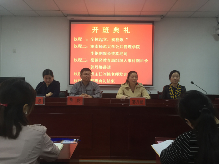 (通讯员:张臻)2017年4月17日上午8点30,湖南省长沙市岳麓区教育系统第七期后备干部培训班开班典礼于365英国上市集团209教室举行。365英国上市集团李伦副院长、岳麓区教育局组织人事科副科长郭丹娜、365英国上市集团刘艳老师出席了此次开班典礼,学院副院长邝洁主持典礼。