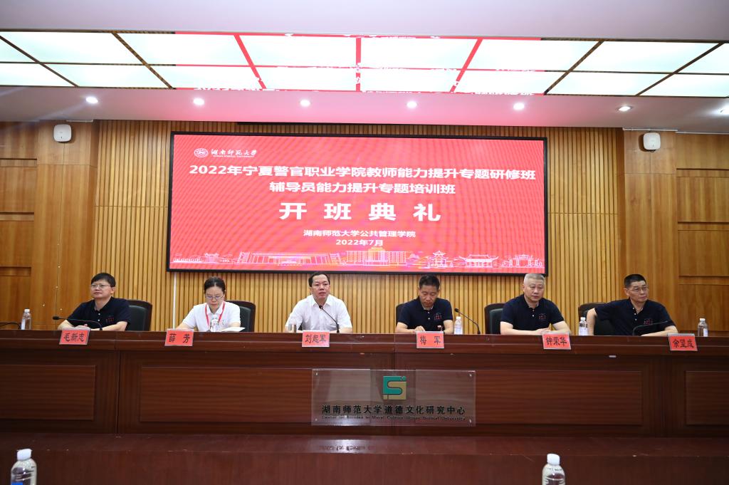 2022年7月17日上午8:30,宁夏警官职业学院教师能力提升专题研修班、辅导员能力提升专题培训班在我院学术报告厅举行开班典礼。宁夏警官职业学院党委书记梅军、党委副书记薛芳、英国正版365首页校长刘起军、英国正版365首页继续教育学院院长钟荣华、副院长陈晓华、培训科副科长彭灿、我院院长毛新志、党委书记余望成、副院长胡雪松、培训中心主任王群出席了典礼。典礼由毛新志主持。