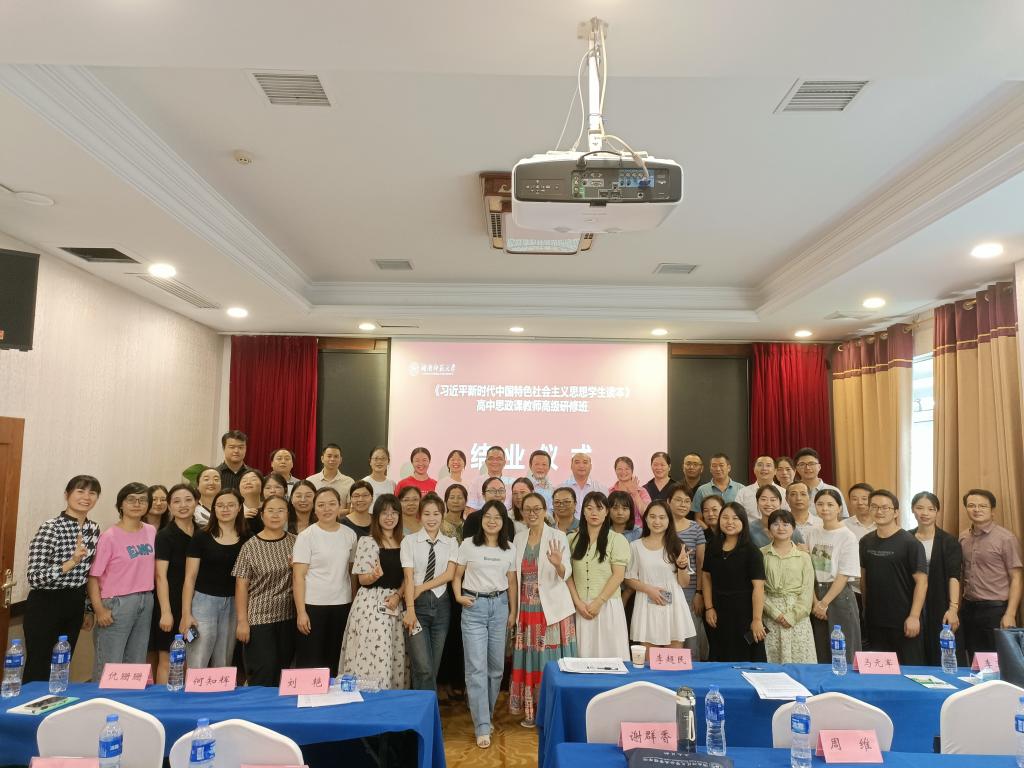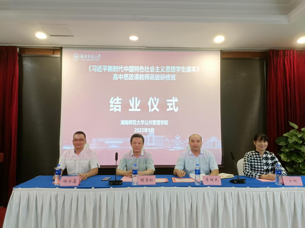 9月20日上午11点,由我院承办的“国培计划2022”—《习近平新时代中国特色社会主义思想学生读本》高中思政课教师高级研修班(S203)结业典礼在通程麓山大酒店三号楼一楼湘麓厅圆满举行。我院副院长胡雪松、李超民、培训中心主任王群和班主任谢宗藩出席了典礼。典礼由邹水平老师主持。