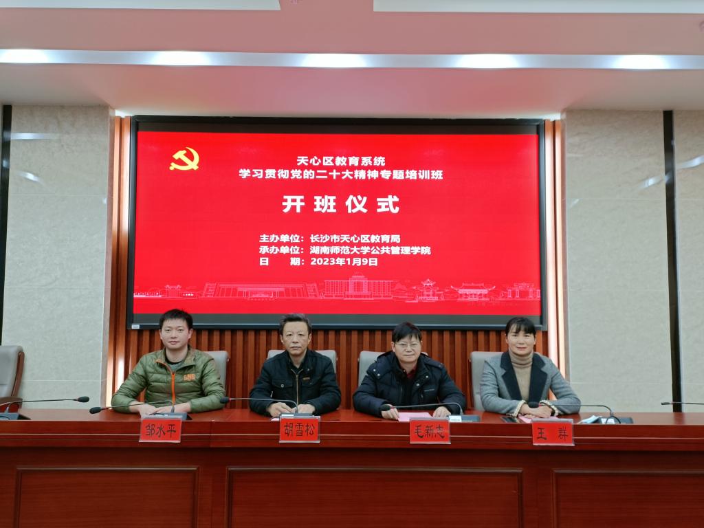 1月9日上午9:00,由长沙市天心区教育局主办、我院承办的天心区教育系统学习贯彻党的二十大精神专题培训班开班仪式顺利举行。本次开班仪式采用线上方式进行,天心区教育局党委书记、局长张伟、局党委委员、副局长张其林、我院院长毛新志、副院长胡雪松、培训中心主任王群和班主任邹水平出席了本次仪式。仪式由张其林副局长主持。