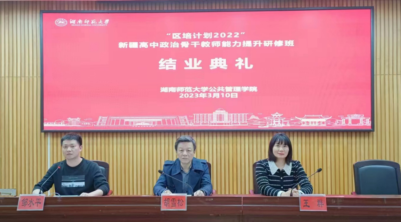 3月10日下午,由新疆维吾尔自治区教育厅主办、我院承办的“区培计划2022”—新疆高中政治骨干教师能力提升研修班结业典礼在我院三楼报告厅顺利举行。我院副院长胡雪松和培训中心主任王群出席了本次典礼。典礼由班主任邹水平老师主持。