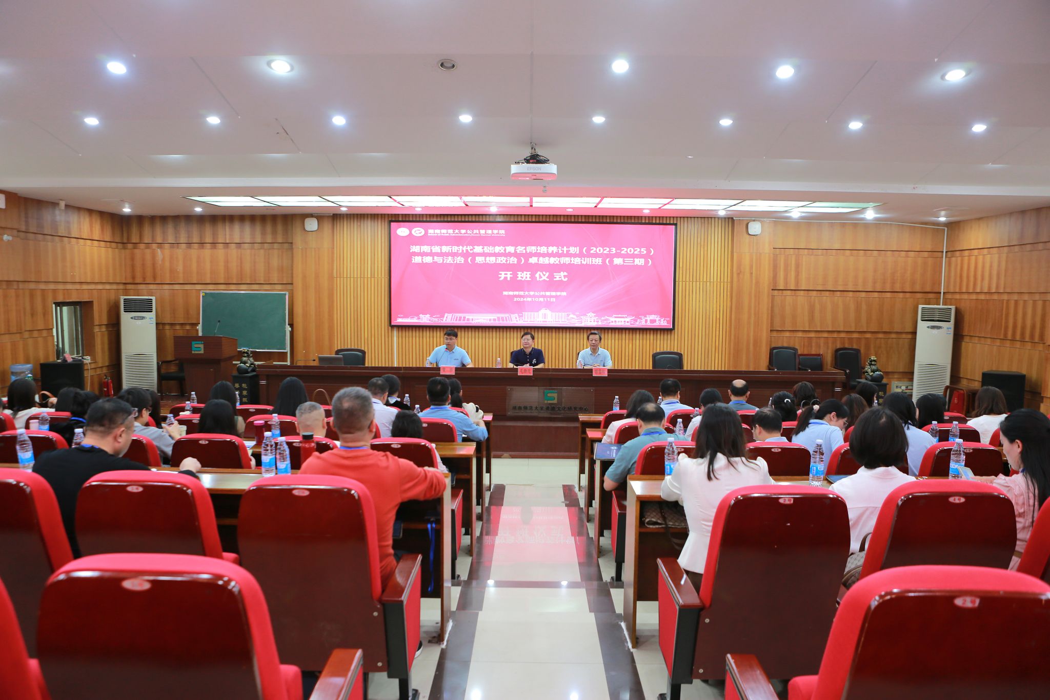 2024年10月11日上午8:30,湖南省新时代基础教育名师培养计划(2023-2025)道德与法治(思想政治)卓越教师培训班(第三期)开班仪式在我院3楼报告厅举行。我院院长、湖南省初中道德与法治名师理论导师毛新志教授、副院长胡雪松出席了开班仪式,仪式由我院培训中心干事、培训班班主任黄根主持。