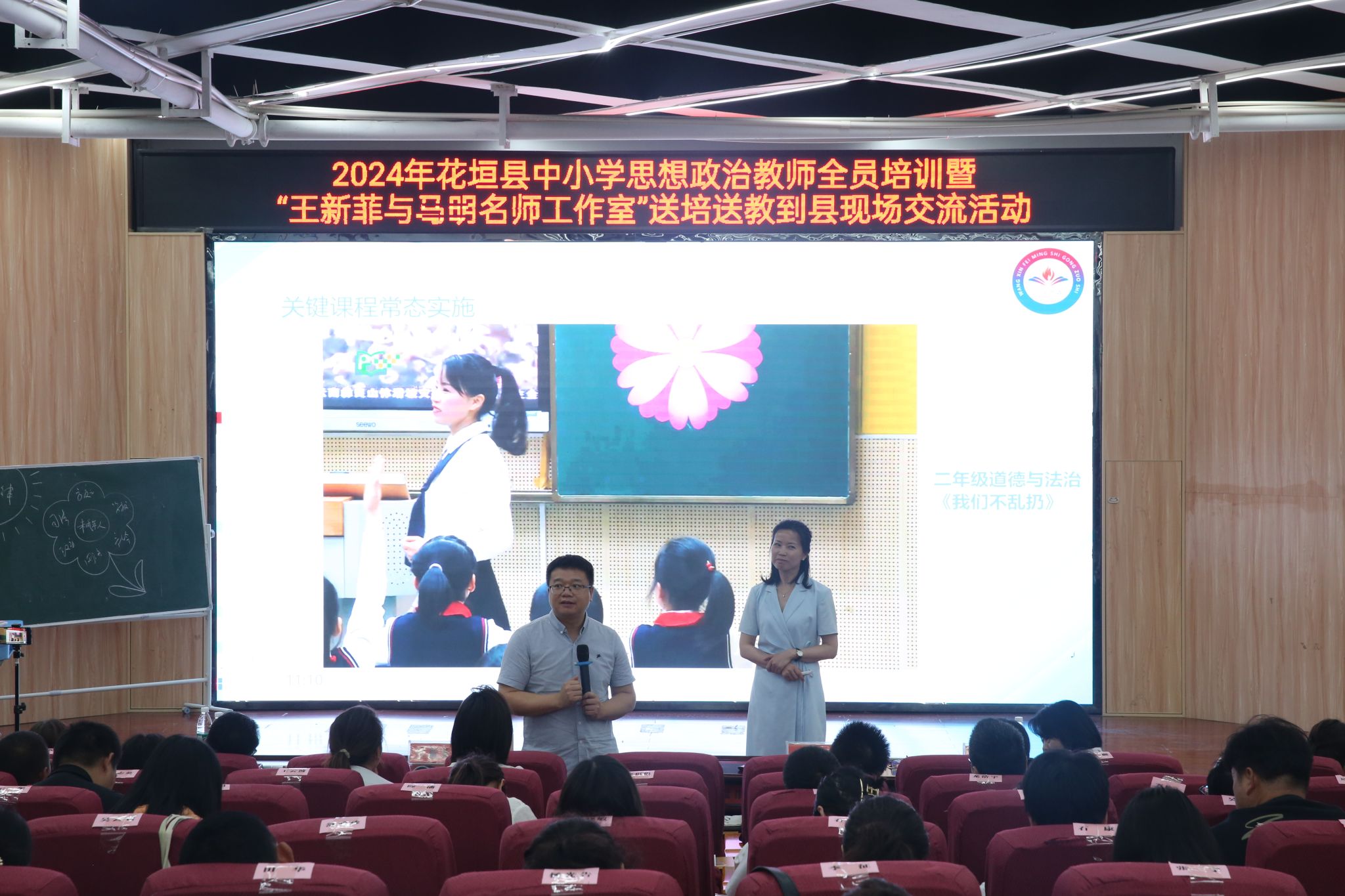 5月17日上午,王新菲和马明名师工作室送培送教交流活动暨花垣县新时代中小学校思政课一体化建设培训交流会在花垣县华鑫学校隆重举行。花垣县教体局党组书记、局长邓显伟、我院培训中心主任邹水平出席了交流会。